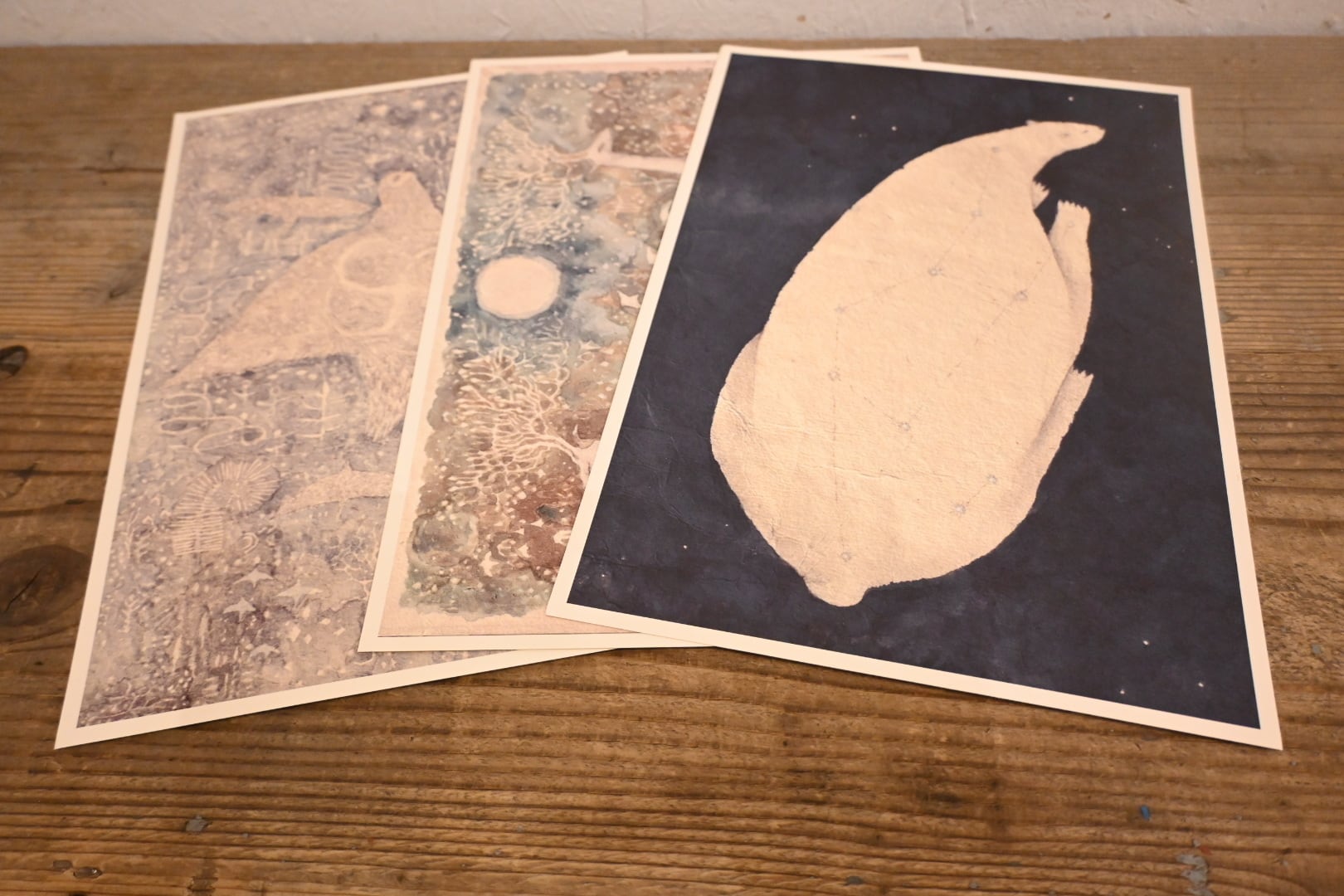 gallery yolchaの堀内拓真個展「星の声を編む」にて展示された作品を、A4サイズのポスターにしたものです。こちらは3種類のセットになります。同サイズ対応のフレームなどに入れて飾っていただけます。