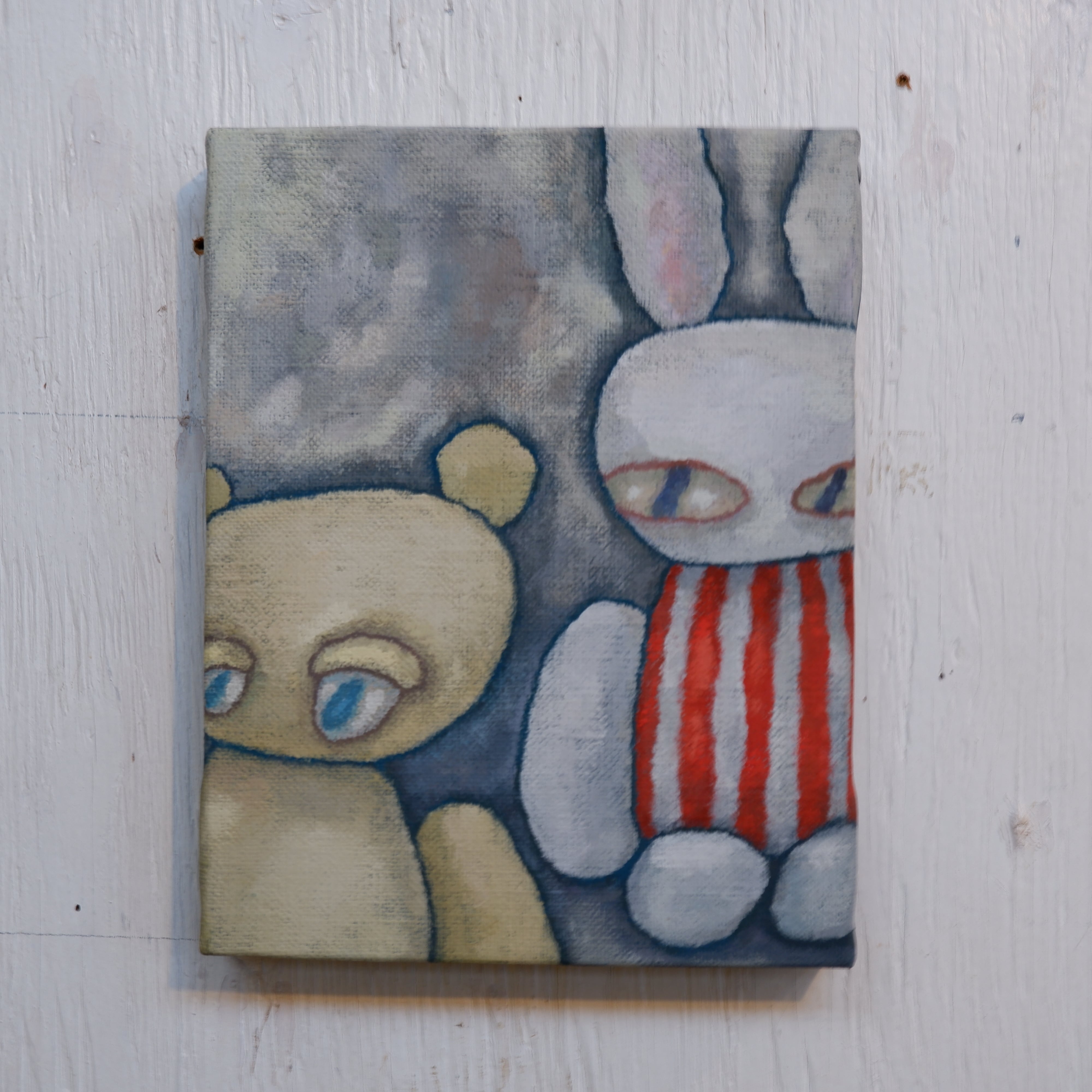 立体作品の「棚にいたきみ(くま)」と「棚にいたきみ(うさぎ)」が両方描かれています。