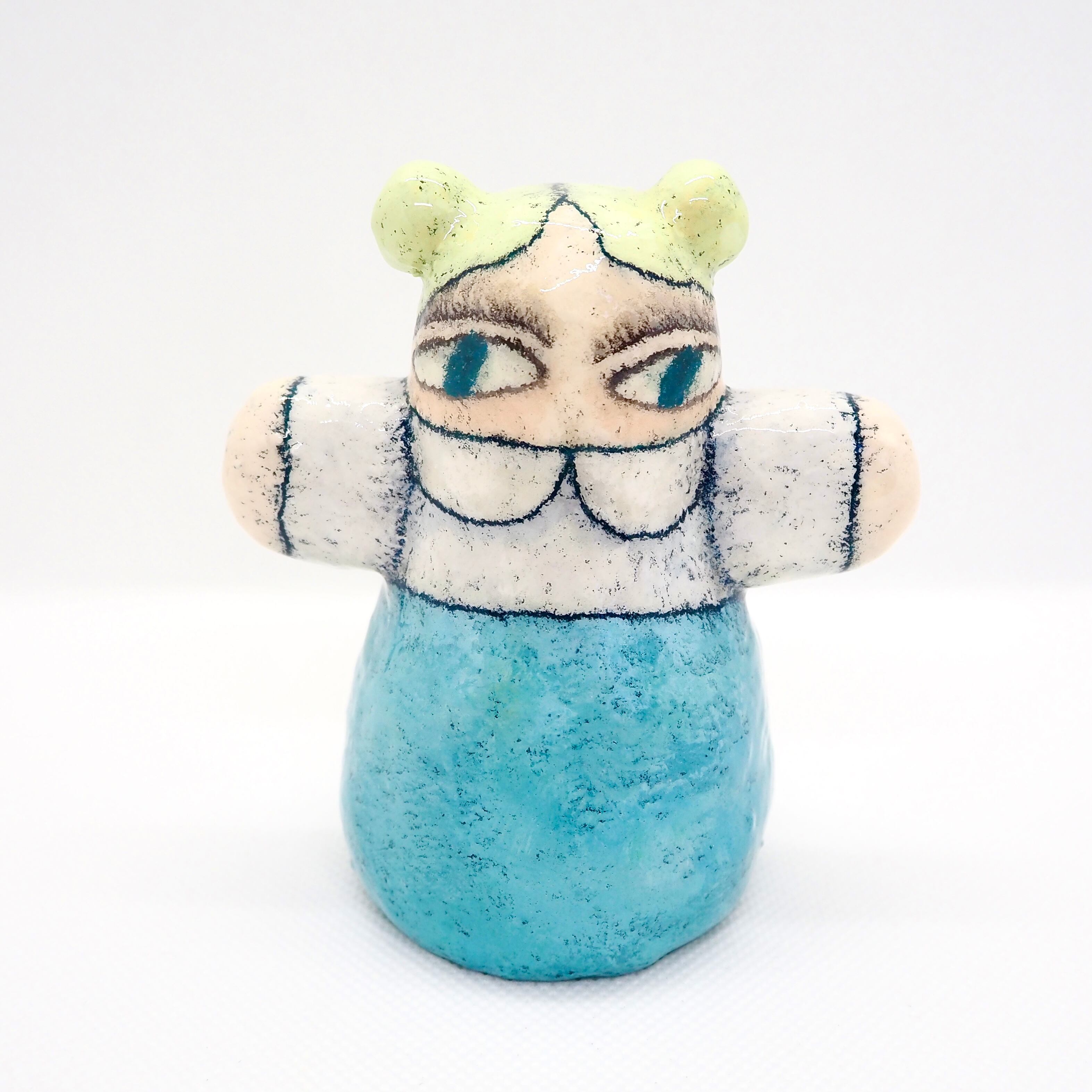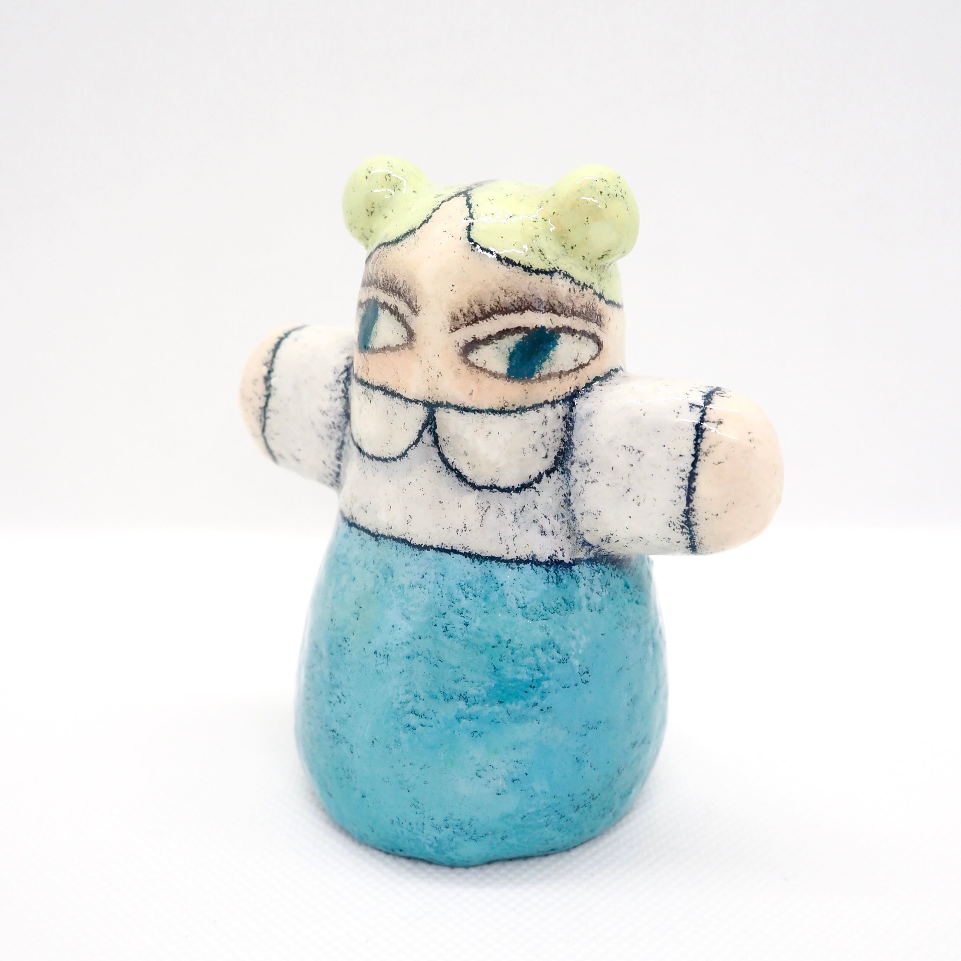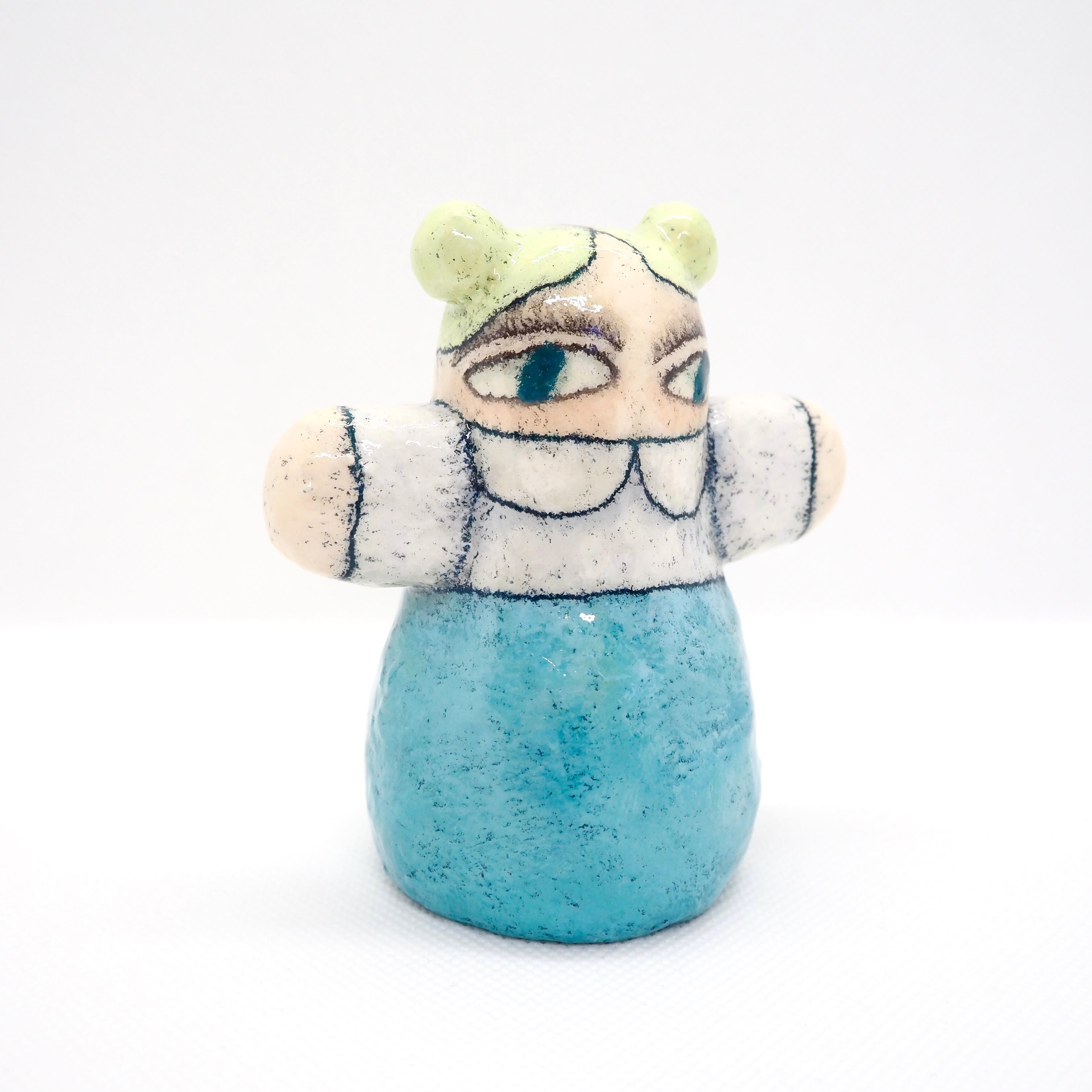 石粉粘土を用いて仕上げに分厚くニスを塗って制作された一点物の立体作品です。